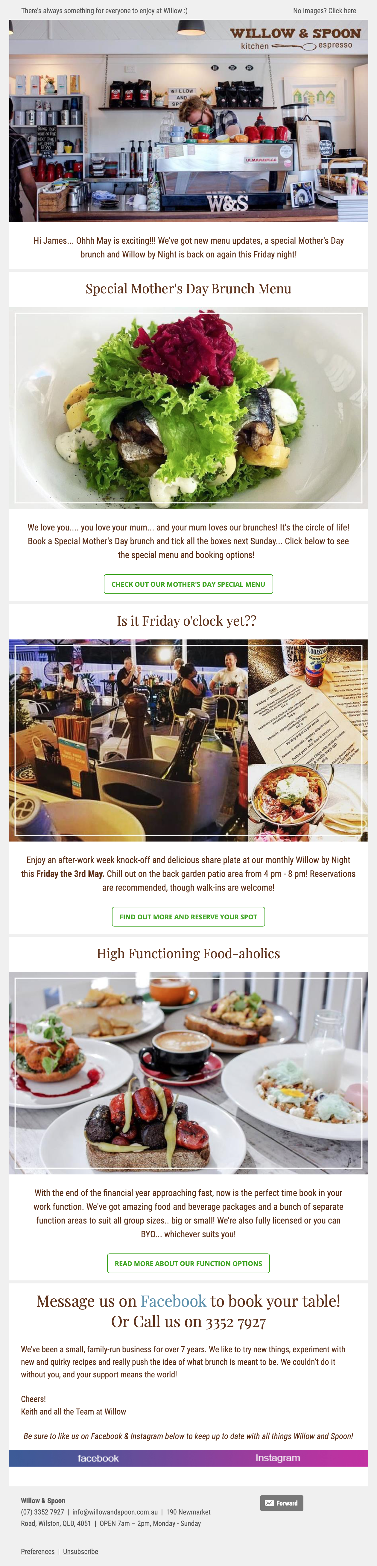 We've been helping Willow and Spoon in Brisbane with their email marketing for the last few years and they now have a very loyal customer base. They’ve seen great open rates of over 30% and very high engagement to view new menus, book events and function spaces.